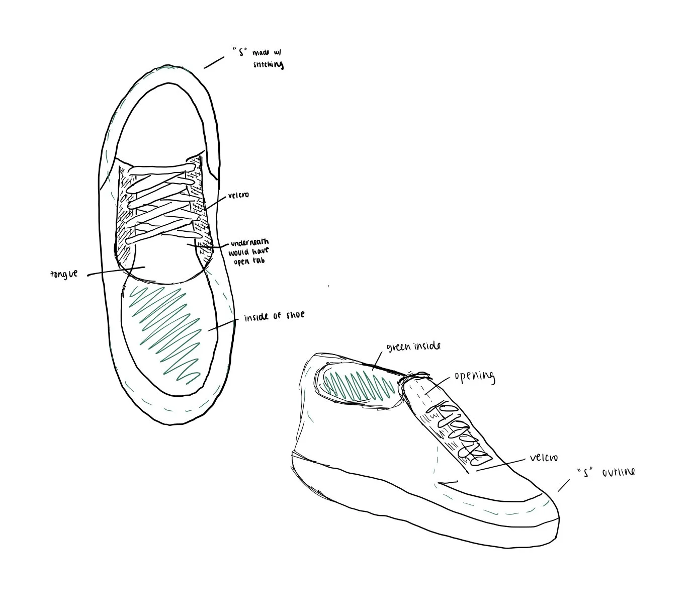 This first ideation (inspired by shoes currently on the market) involves velcro while having an opening in the middle for users to easily slip on and take off their shoe.