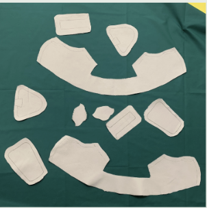 To start the high fidelity prototyping process, lasts (a foot mold that is used to shape the shoe) were created. These lasts were made using cardboard based off of a Men’s Size 11 shoe. Layers of cardboard were placed on top of each other, each piece getting a little smaller in size as the layers increased. After this, came making the pattern. To help, a Men’s Size 12 sneaker pattern was obtained and changes were made where needed to adjust the size to a Size 11. Once the pattern was done, the team moved onto tracing the pattern onto the canvas and green fabric. These pieces were then cut out so that the sewing could start.