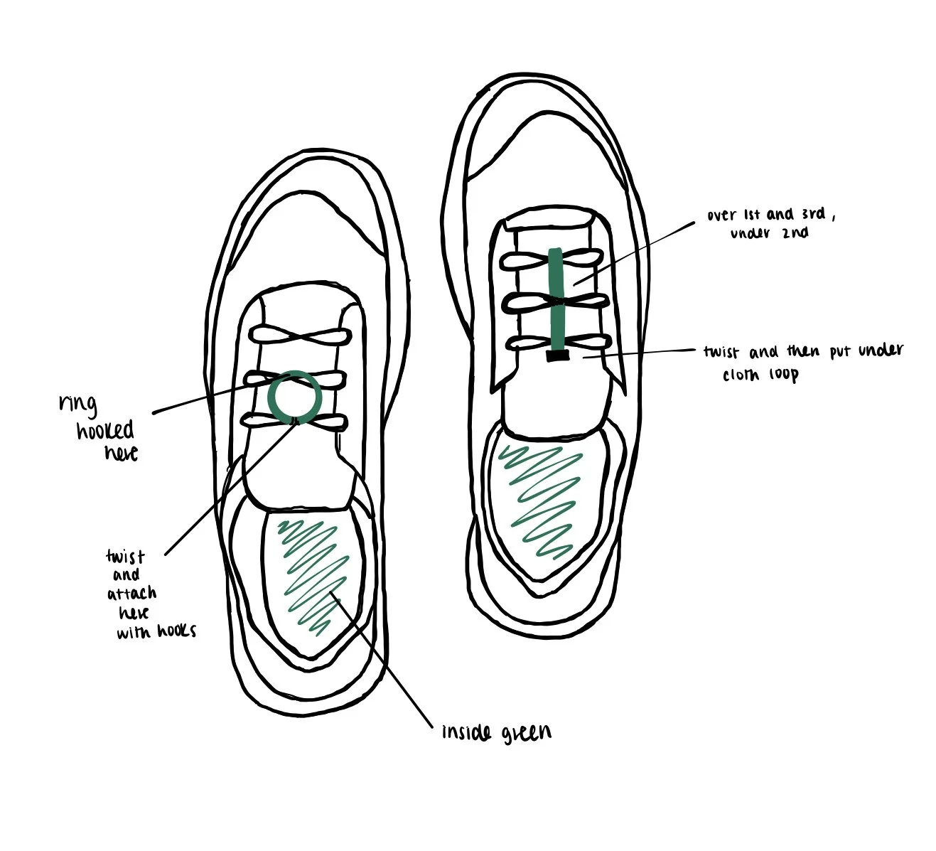 For this next ideation, the team focused on an accessibility mechanism that represents an alternative way to tighten laces. The first one incorporates a ring that will be looped through the middle lace and then twisted and hooked onto the top lace. The second one uses a stick that goes over the first and third laces, while under the middle. From here, it will be twisted and placed under the cloth loop.
