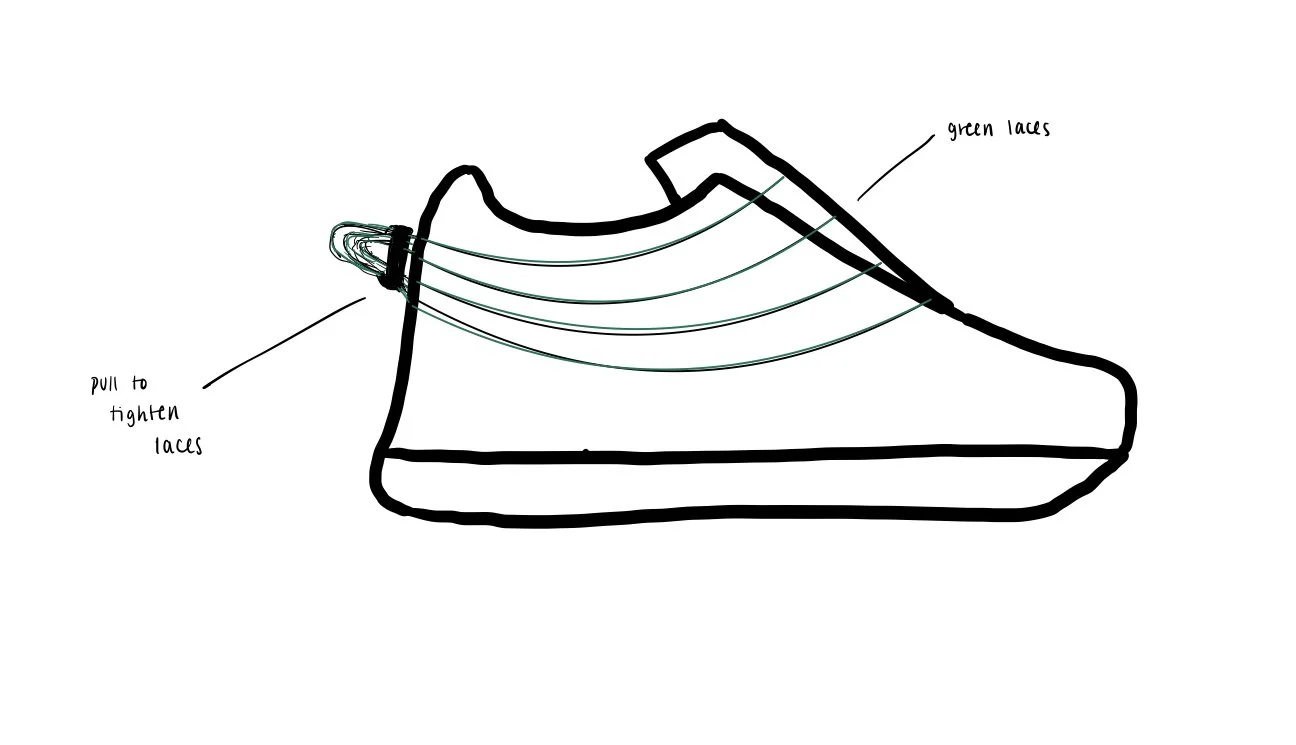 The Drawstring mechanism consisted of four separate laces that were threaded through the eyelets and then wrapped around to the back of the sneaker. A cord lock (represented in the rough prototype as a rubber band) was added to the laces at the back of the shoe. To tighten this prototype, the user would pull the laces from the back, and push the cord lock forward.